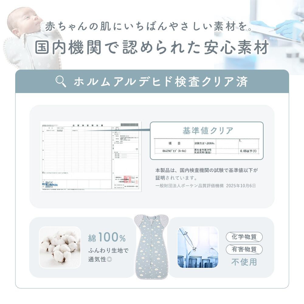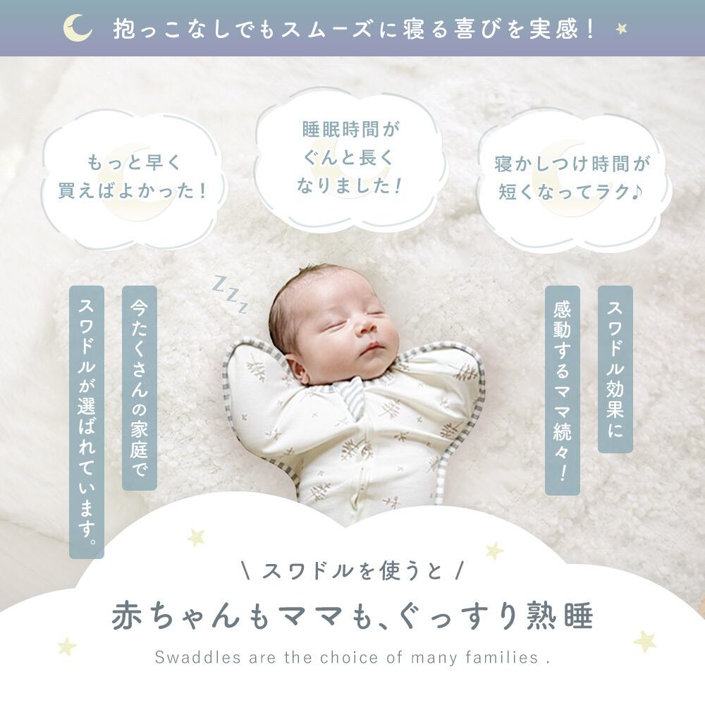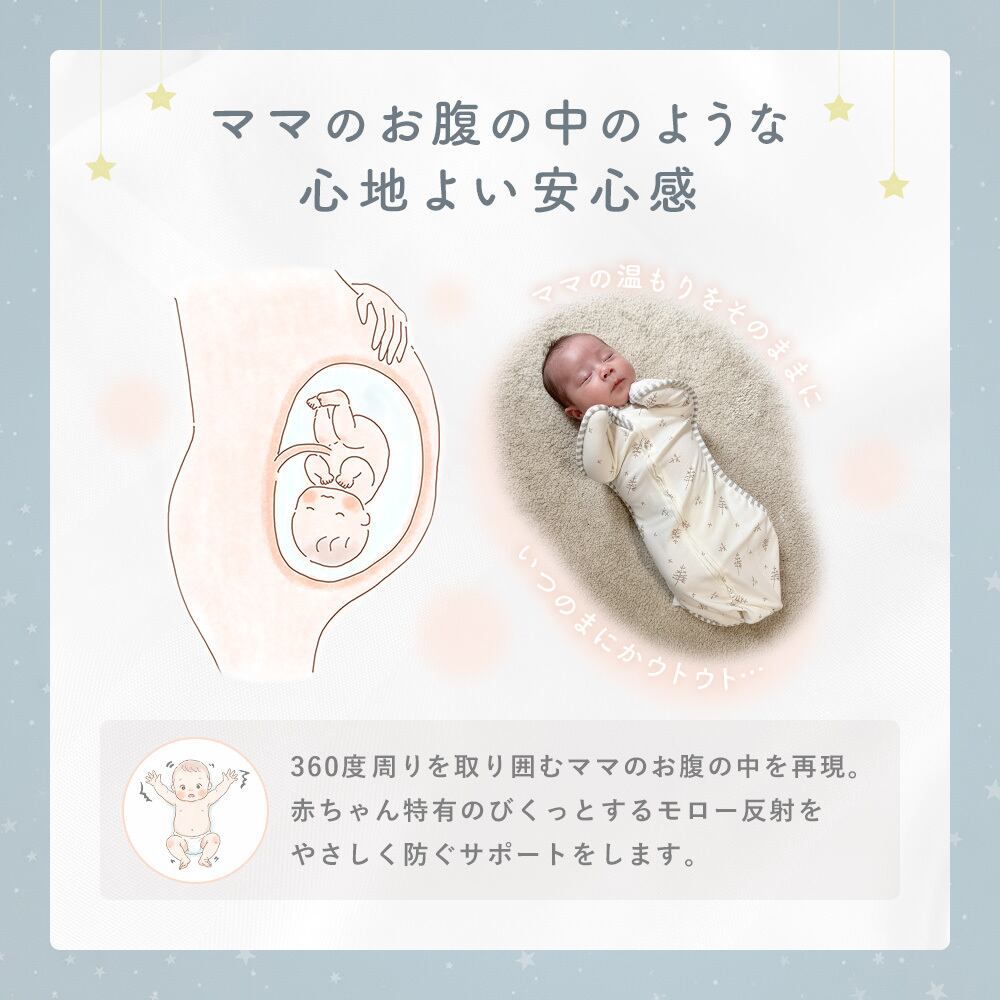 寝ぐずりやモロー反射によるびっくり起きも軽減し、ぐっすり快眠をサポート。
